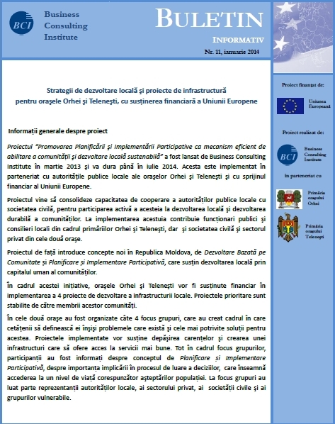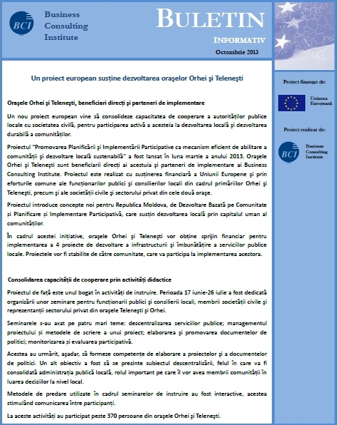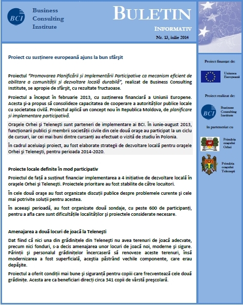 21.07.2014 - Proiect cu susţinere europeană ajuns la bun sfârşitProiectul “Promovarea Planificării și Implementării Participative ca mecanism eficient de abilitare a comunității și dezvoltare locală durabilă”, realizat de Business Consulting Institute, se apropie de sfârşit, cu rezultate fructuoase. În cadrul acestuia, oraşele Orhei şi Teleneşti au fost susţinute financiar în realizarea a 4 iniţiative de dezvoltare locală, prin care au fost îmbunătăţite infrastructura şi serviciile publice prestate.