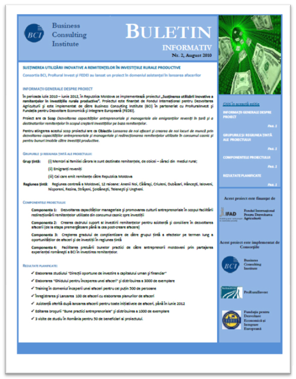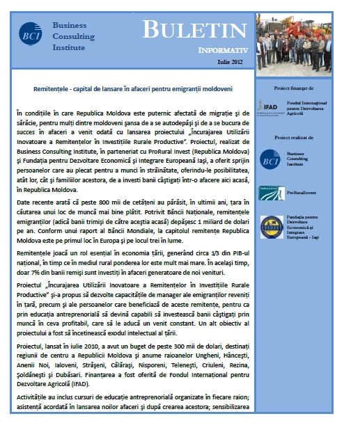 În condiţiile în care Republica Moldova este puternic afectată de migraţie şi de sărăcie, pentru mulţi dintre moldoveni şansa de a se autodepăşi şi de a se bucura de succes în afaceri a venit odată cu lansarea proiectului „Încurajarea Utilizării Inovatoare a Remitenţelor în Investiţiile Rurale Productive”. Proiectul, realizat de Business Consulting Institute, în parteneriat cu ProRural Invest (Republica Moldova) şi Fundaţia pentru Dezvoltare Economică şi Integrare Europeană Iaşi, a oferit sprijin persoanelor care au plecat pentru a munci în străinătate, oferindu-le posibilitatea, atât lor, cât şi familiilor acestora, de a investi banii câştigaţi într-o afacere aici acasă, în Republica Moldova.