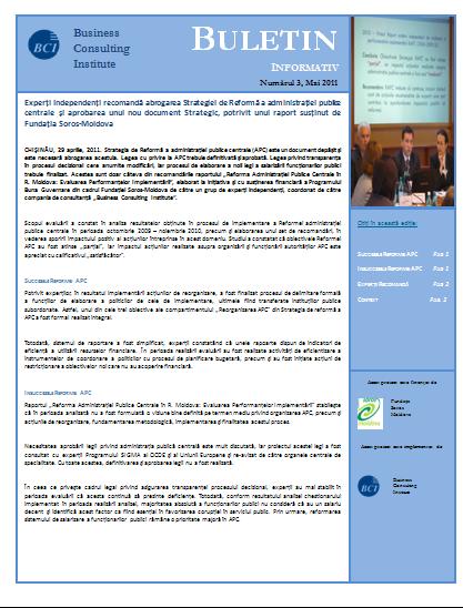 Pe 29 aprilie 2011, la Chişinău a fost lansat Raportul „Reforma Administraţiei Publice Centrale în R. Moldova: Evaluarea Performanţelor Implementării”, susţinut financiar de Programul Buna Guvernare din cadrul Fundaţiei Soros-Moldova. Acesta a fost elaborat de către un grup de experţi independenţi, coordonat de către Business Consulting Institute. Experţii au arătat evoluţia Reformei APC, cu reuşitele şi insuccesele ei şi au formulat recomandări care să ghideze în continuare reformarea administraţiei publice centrale.