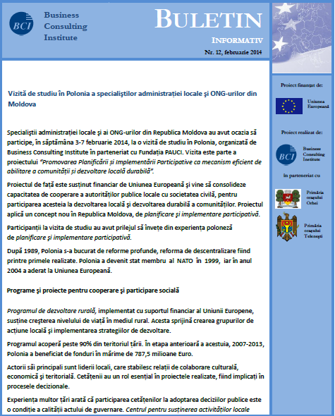 Specialiştii administraţiei locale şi ai ONG-urilor din Republica Moldova au avut ocazia să participe, în săptămâna 3-7 februarie 2014, la o vizită de studiu în Polonia, organizată de Business Consulting Institute în parteneriat cu Fundaţia PAUCI. Participanţii la vizita de studiu au avut prilejul să înveţe din experienţa poloneză de planificare şi implementare participativă, care constituie un concept nou în Moldova.